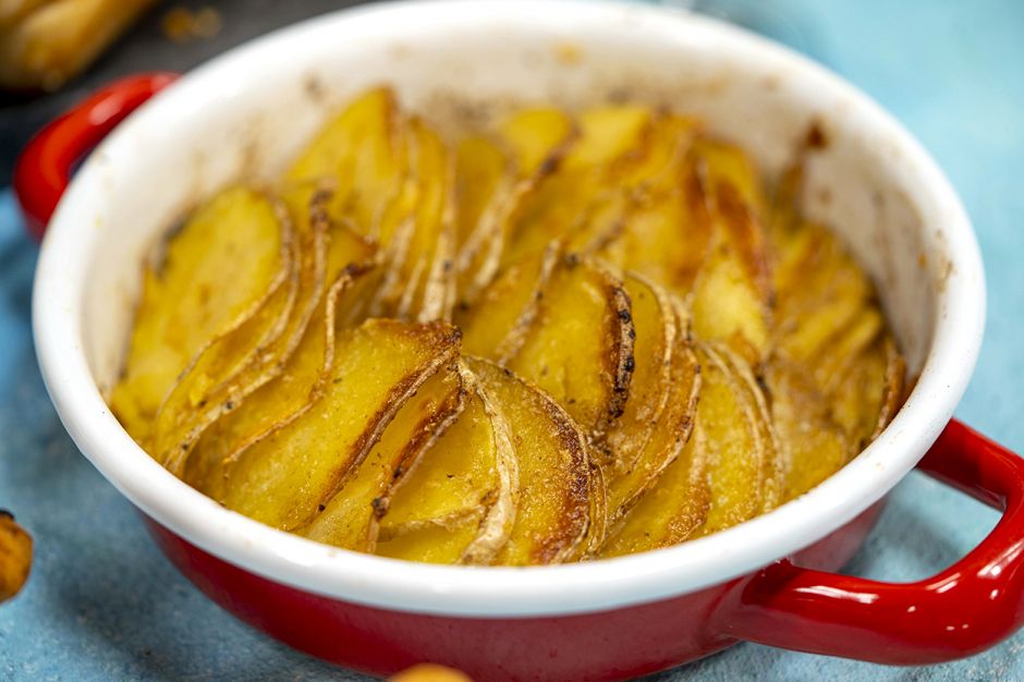 3. Ufak bir fırın kabı ya da sahanı sarımsaklı yağ ile kaplayın, içine patatesleri dizin ve kalan sosu aralara girecek şekilde üzerine dökün.