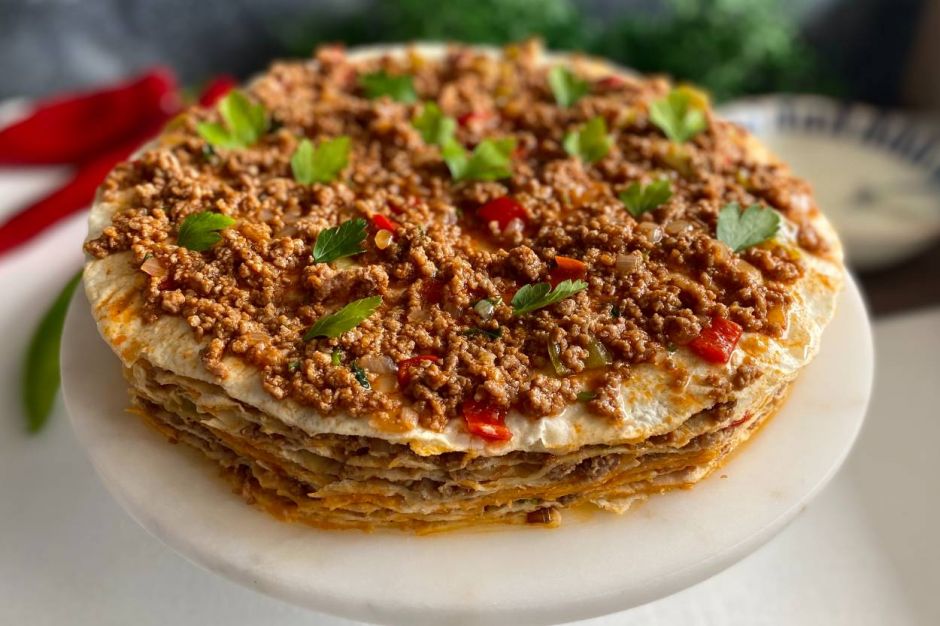- Üstüne tekrar lavaş,tekrar kıyma şeklinde bitene kadar devam edin. Tüm harç ve lavaşlar bitince yağlamanız hazır! Dilimleyip üzerine sarımsaklı yoğurt ilave ederek servis edebilirsiniz. Afiyetler olsun.