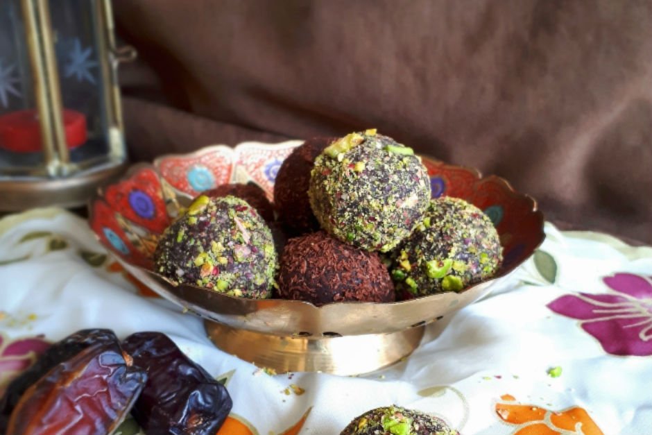 - Topçukları, başta ayırdığımız çekilmiş fıstığa ve azıcık kakaoyla karıştırılmış Hindistan cevizine buluyoruz. Ve servise hazır. Afiyet olsun.