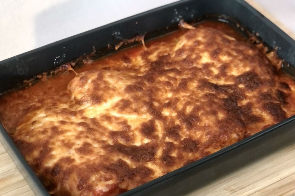 - Fırın kalıbının içerisine tavukları dizin ve üzerine domatesli sosu dökün.