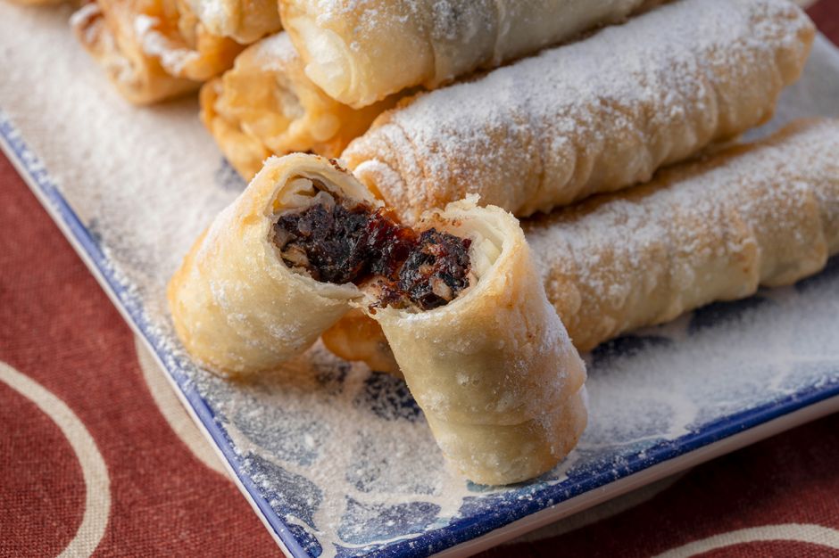Her bir yufkayı on iki üçgen dilime kesin. Her bir üçgenin uzun kenarına 1 tatlı kaşığı dolusu harç koyup kalem börek gibi sarın. Uçlarını hafifçe suya batırıp yapıştırın.