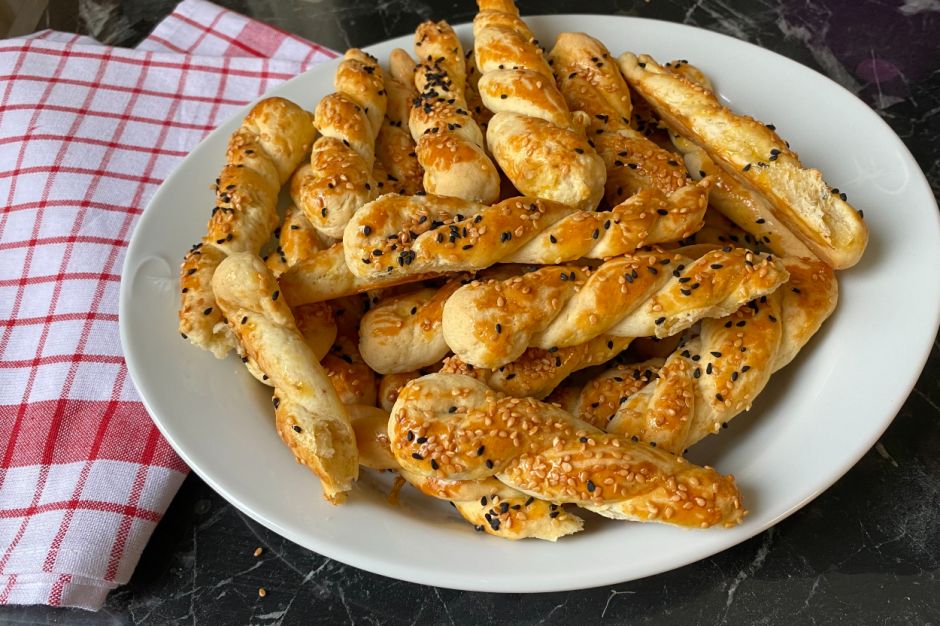 - Yoğurduğunuz hamurdan parçalar alıp, ince uzun şekilde yuvarlayalım. 2 ye katlayıp döndürelim(örgü şeklini verelim) Dilerseniz başka şekilde yapabilirsiniz.