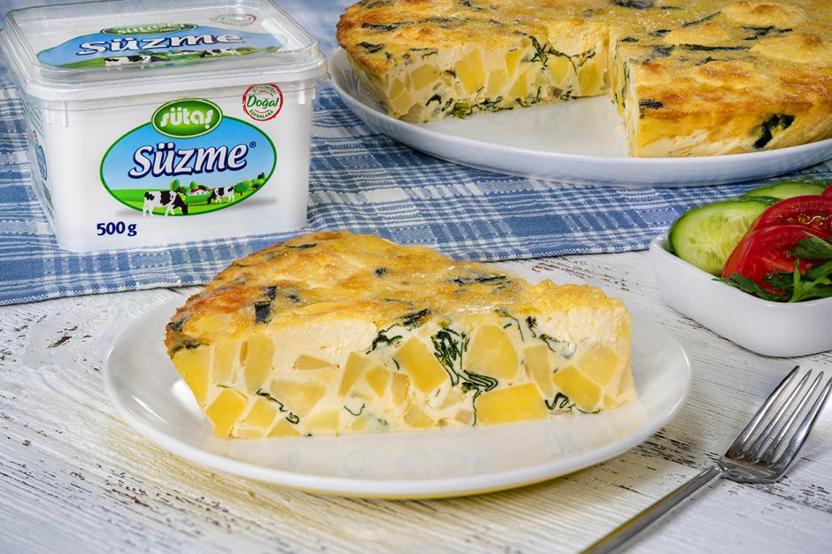 Küp küp doğranan patatesler haşlanıyor, soğanla birlikte sotelenen ıspanaklarla buluşuyor. Ardından bol bol çırpılmış yumurta ve yumuşacık Sütaş Süzme'yle karıştırılarak, yavaş yavaş fırında pişiriliyor. Görüntüsü tuzlu keke benzer, lezzeti ise çok daha güzel olan süzmeli patatesli omlet hazır bile! Afiyetler olsun.