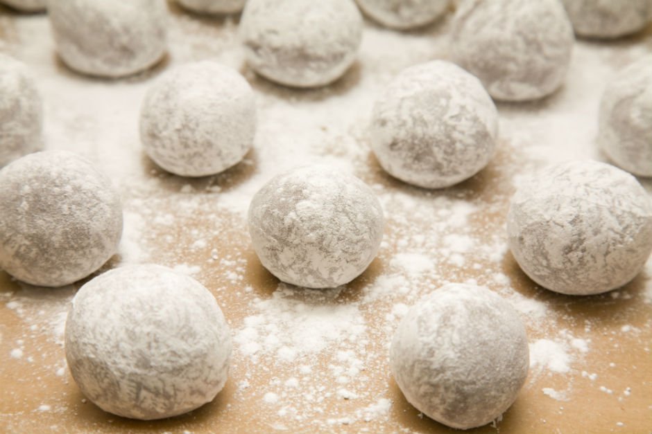 4. Buzdolabından çıkardıktan sonra kurabiye hamurunuzdan misket büyüklüğünde parçalar yuvarlayın ve yağlı kağıt serdiğiniz fırın tepsisine kurabiyeleri dizin.