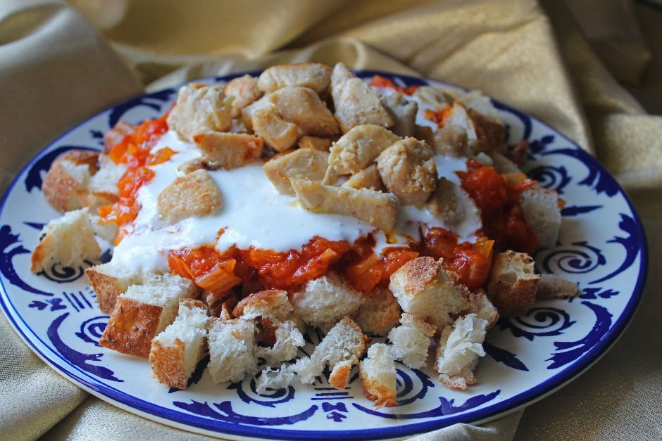- Bir servis tabağına kızarmış olan pideleri alın, üstlerine hazırladığınız domates sostan gezdirin, onun üstüne sarımsaklı yoğurdu gezdirin ve en üste de tavuk etlerini koyup, sıcak sıcak servis edin.